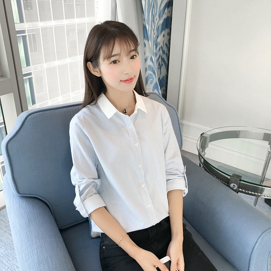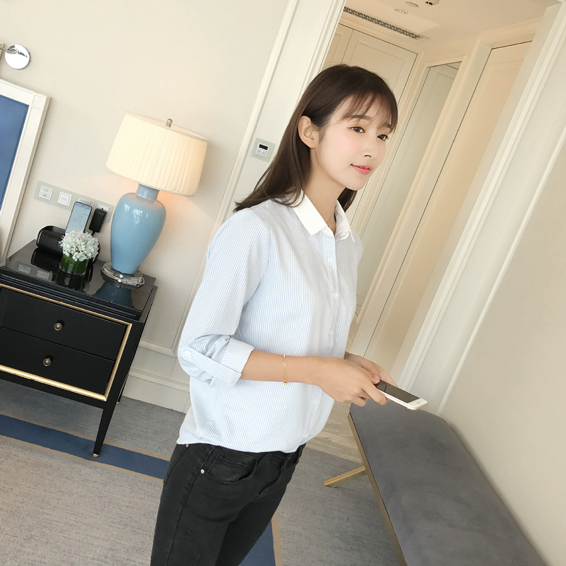 我終於找到了免運 秋裝新款豎條紋棉襯衫女長袖韓范女士拼白領子打底襯衣S4619 OPP!